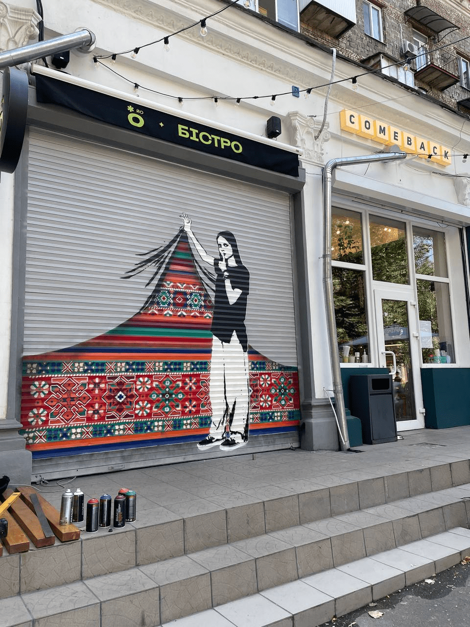 На входе в бистро размещается зона для наклеек, которые может приклеить каждый посетитель. Наклейки здесь самые разные: от культовой мемной лягушки Пепе и воспроизведения работ Бенкси до рекламного мерча компаний. Стикеры занимают особое место в культуре стрит-арта. Традиция украшать ими уличные объекты пришла в Европу из Америки в начале 2000-х и быстро приобрела популярность среди уличных художников.